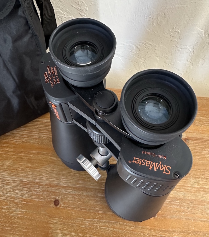 The objective lenses of the SkyMaster 20x80s are standard 80mm achromatic lenses like what would be used in a refractor, though with a fast f/ratio of f/4.11, meaning that they were not designed for the ability to deliver sharp images at high power without a lot of chromatic aberration – which is fine, since the magnification is fixed at 20x.